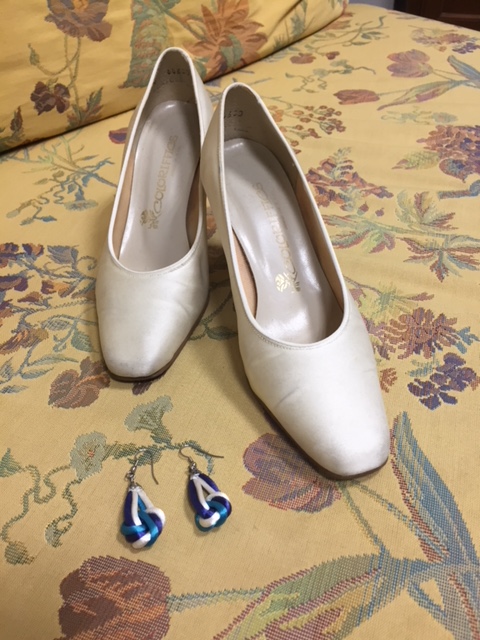 現在実施中の「トータル・コーデ フェア」で、オフホワイトのサテンシューズと、ドレスと同色のピアスをお選びいただきました。