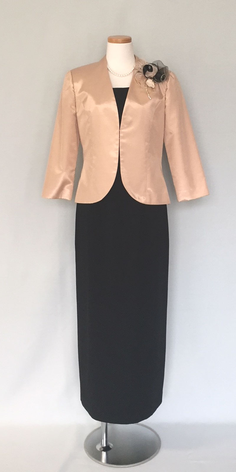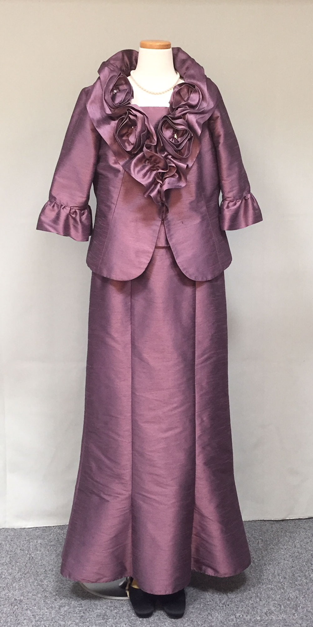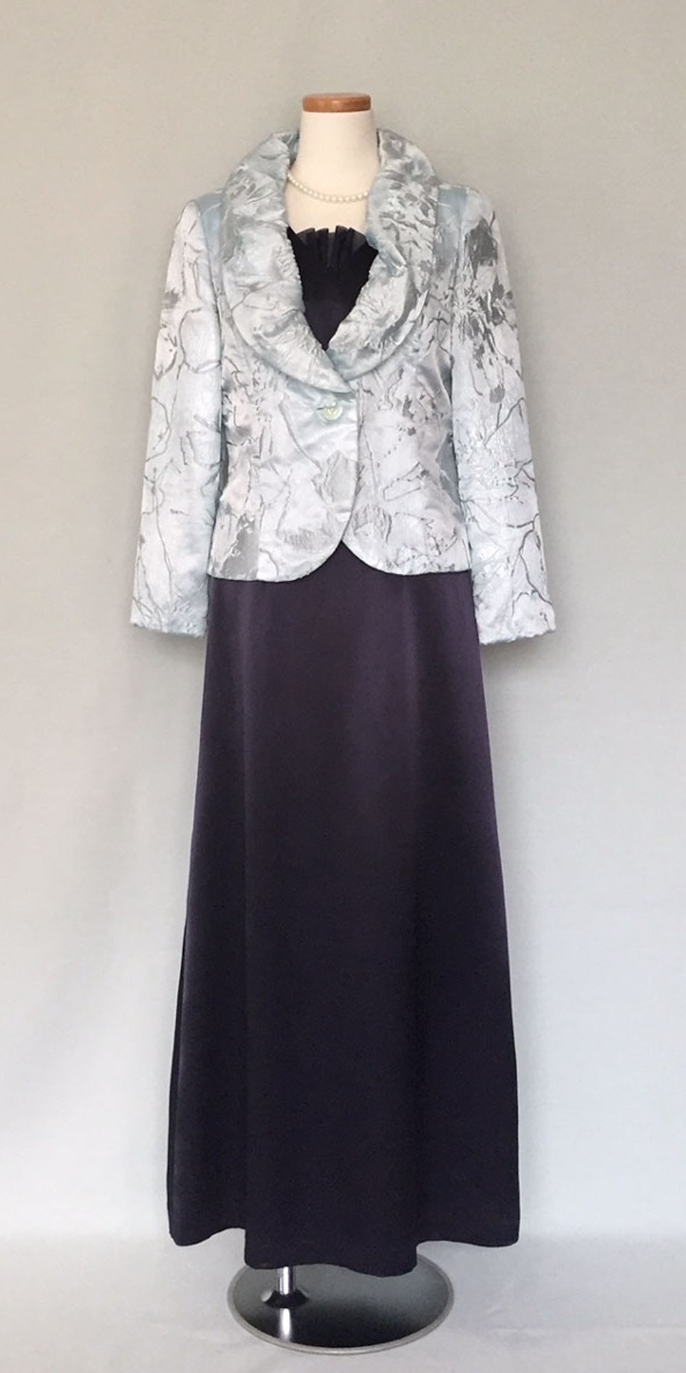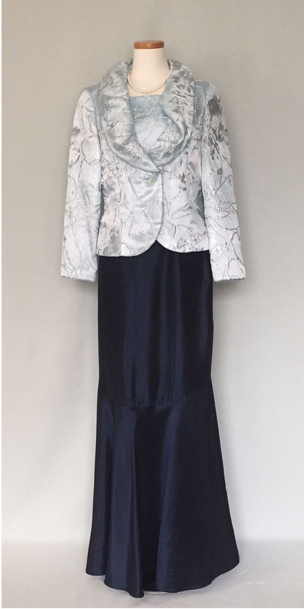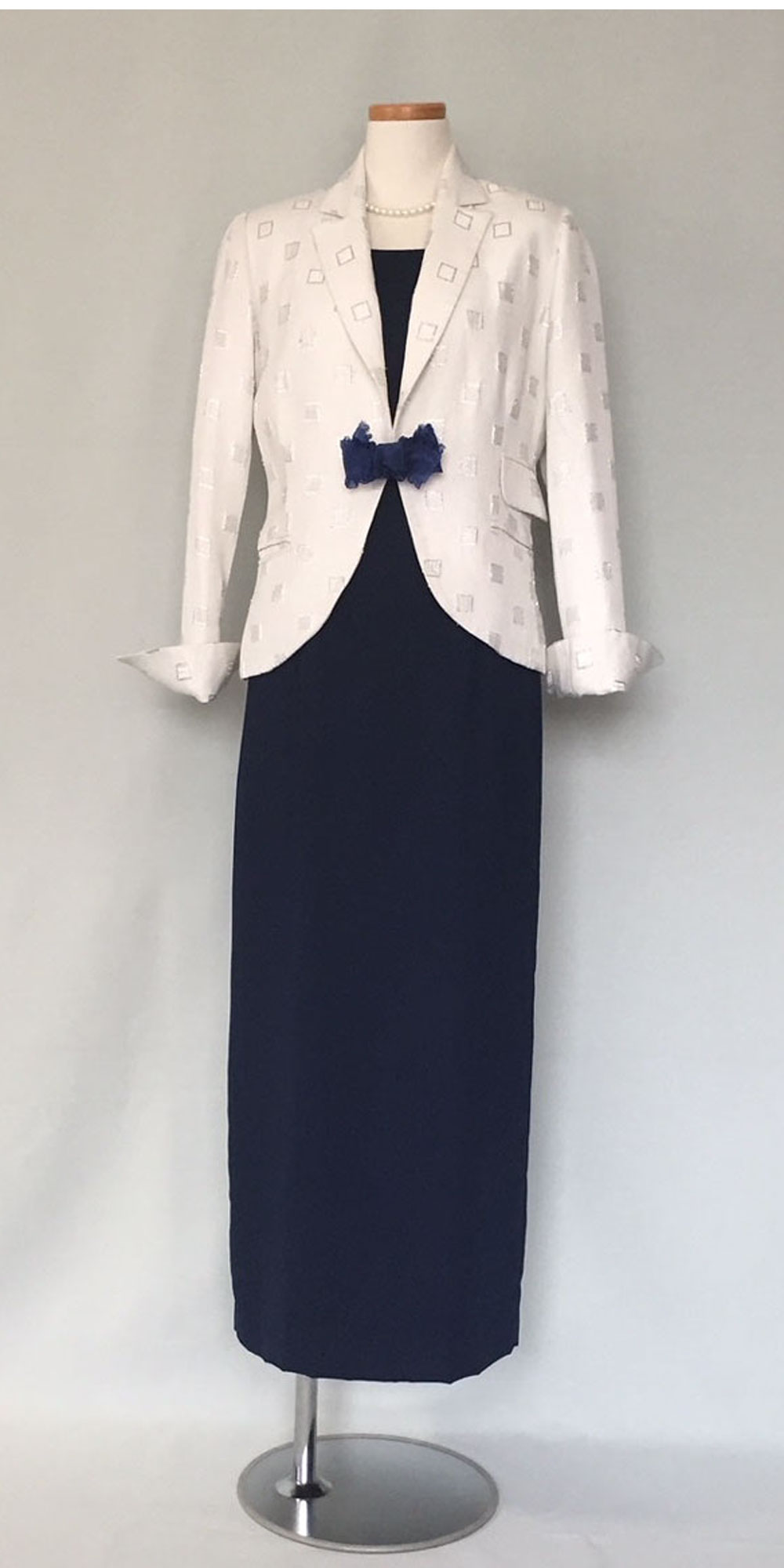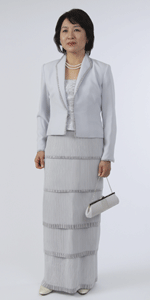 ◆一般的な結婚式でのお母様を始めとするご親族様に。ワンピースドレスやロング丈のスカートに、フォーマルに相応しいクオリティの高い素材のジャケットでコーディネートする準礼装です。昼の時間帯に肩を出すのはマナー違反です。