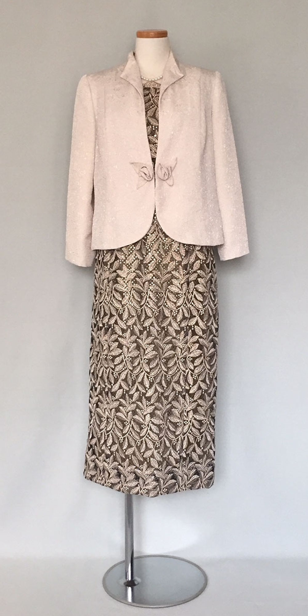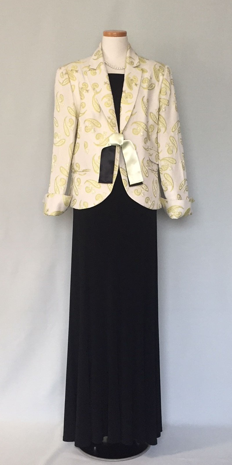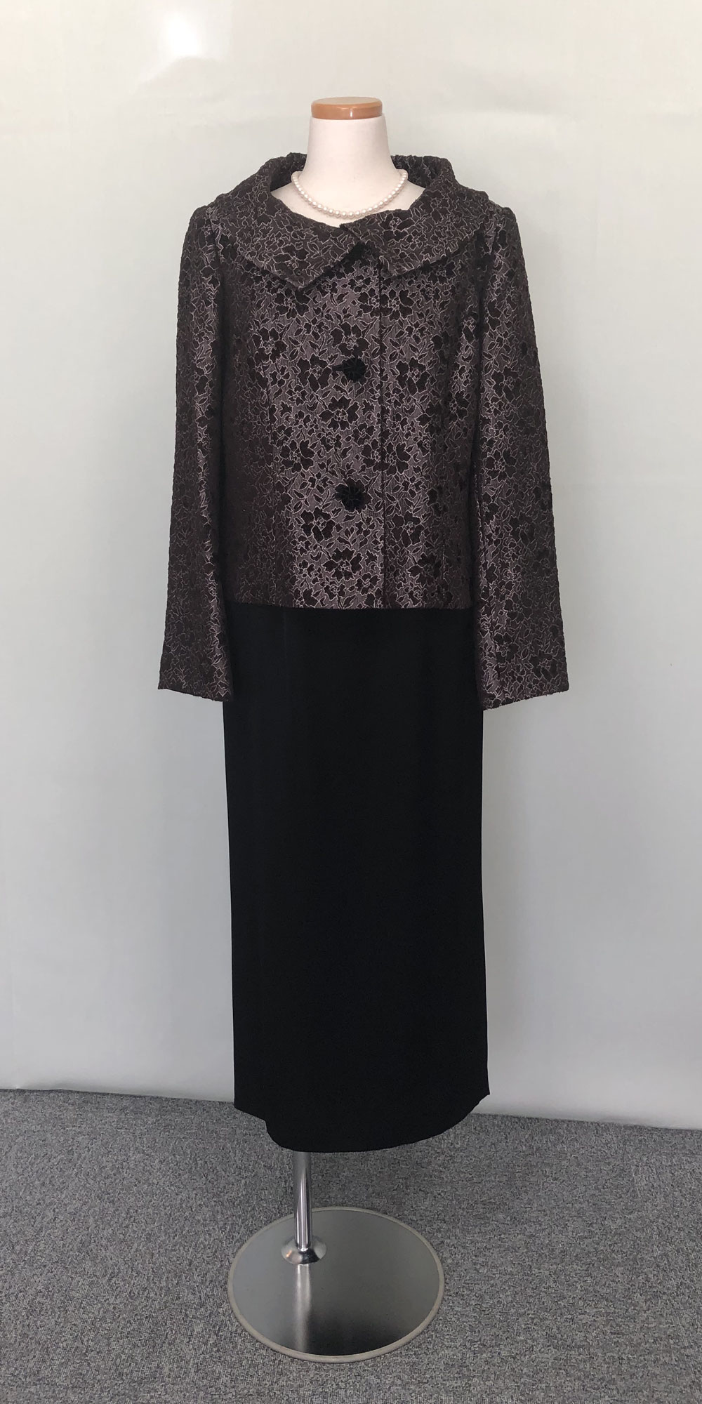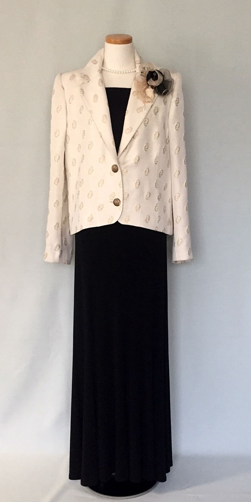 ◆一般的な結婚式でのお母様を始めとするご親族様に。ワンピースドレスやロング丈のスカートに、フォーマルに相応しいクオリティの高い素材のジャケットでコーディネートする準礼装です。昼の時間帯に肩を出すのはマナー違反です。